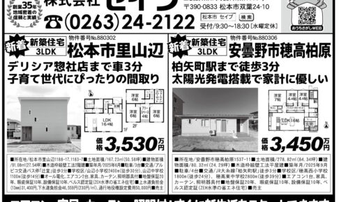 株式会社セイブ 新築住宅 松本市里山辺 価格3,530万円 周辺施設 山辺小学校 徒歩30分 山辺中学校 徒歩14分 イオンモール車で8分 デリシア惣社店 車で3分 新築平屋住宅 松本市寿北3丁目 価格3,520万円 …