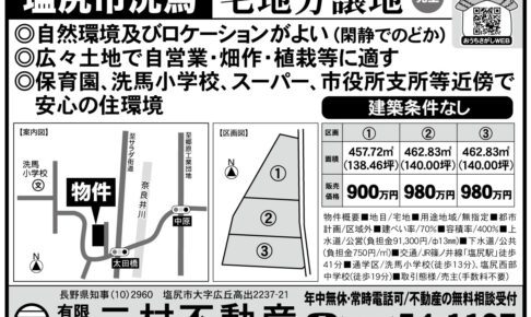 有限会社二村不動産 新規分譲地 塩尻市洗馬価格900万円~ 北東側より 南西側より 南東側より 区画1 区画2 区画3 周辺施設 洗馬小学校徒歩13分 塩尻西部中学校徒歩19分 JR塩尻駅車で8分 西友塩尻西店車で6分 …