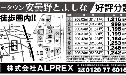 株式会社ALPREX 分譲地 安曇野市豊科価格999万円~ 北側より 北西側より 南側より 西南側より 西側より 区画15.16.17 区画9南側より 区画5 区画1.2 東北側より 周辺施設 豊科北小学校徒歩27分 豊…