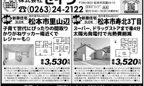 株式会社セイブ 新築住宅 松本市里山辺価格3,530万円 周辺施設 山辺小学校徒歩30分 山辺中学校徒歩14分 イオンモール車で8分 デリシア惣社店車で3分 新築平屋住宅 松本市寿北3丁目価格3,520万円 周辺施設 …
