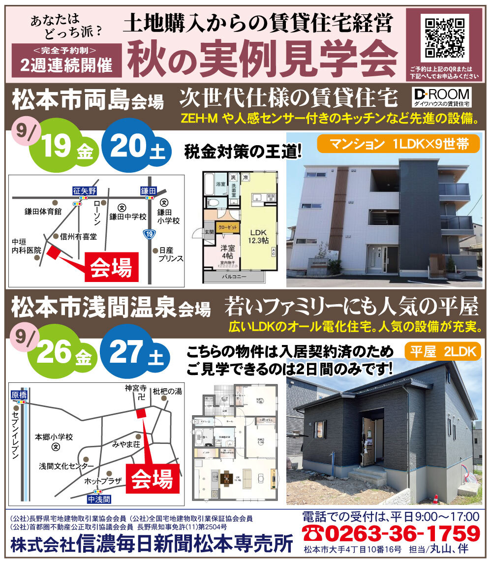 信濃毎日新聞松本専売所 不動産部電話番号:0263-36-1759(電話からでも受付可能です。)(月~金曜日 10:00~17:00受付)※土日祝・営業時間外を除く